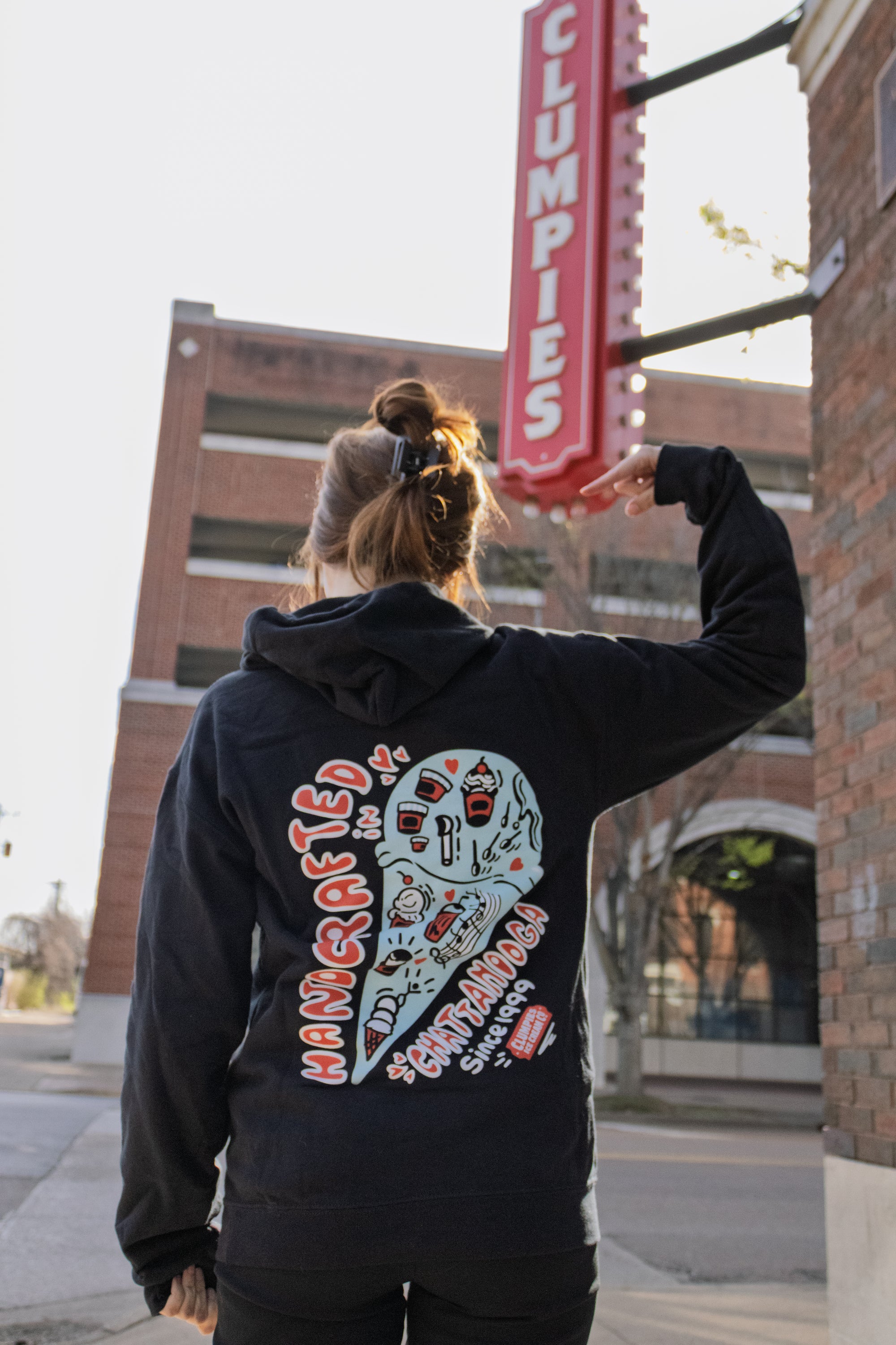 Snag one o of our graphic hoodies to represent Clumpies in style! This black hoodie features a simple cone on the front and a full-art design on the back. And we always love this shoutout: Handcrafted in Chattanooga Since 1999!